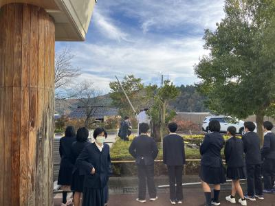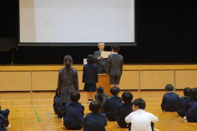 全校集会の前に表彰伝達式がありました。応募作品で優秀だった人や、柳田漢字検定での合格者などを表彰しました。