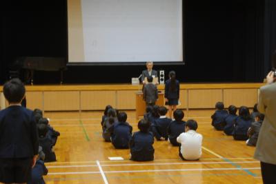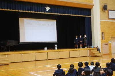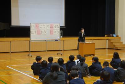 次に、校長先生のお話では、残りの1ヶ月を「話をしっかり聴く」ことと「自分の考えを話す」ことを頑張ってほしいと話されました。また、「人権」について紺谷スクールカウンセラーから、大切にしてほしい4つのこと(言葉)を話されました。