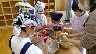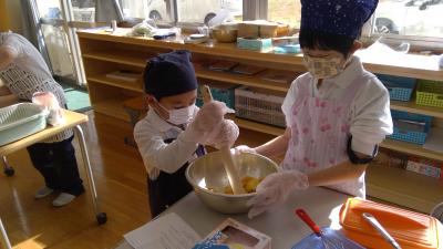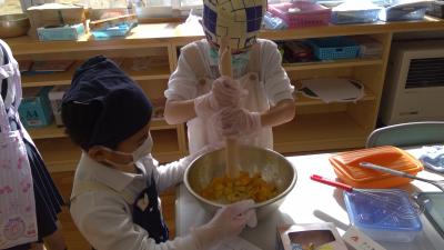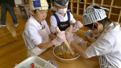 たんぽぽ学級とひまわり学級が合同で、生活科の時間に栽培したさつまいもを使ってケーキ作りに挑戦しました。ピーラーで皮をむいたり、つぶしたり、みんなで協力して作ることができました。