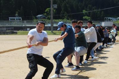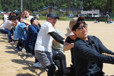 サプライズの保護者種目「綱引き」で、大人の真剣な姿に児童も大喜びでした。