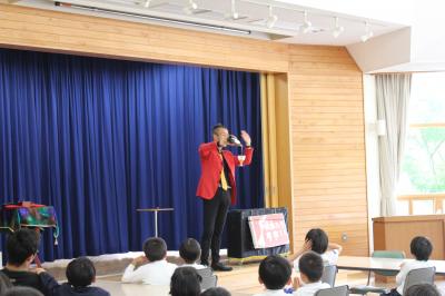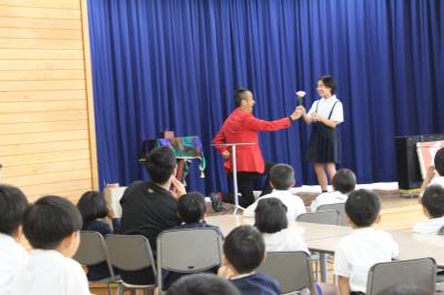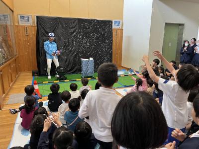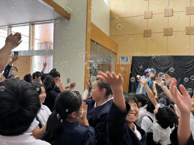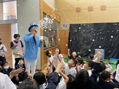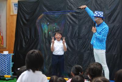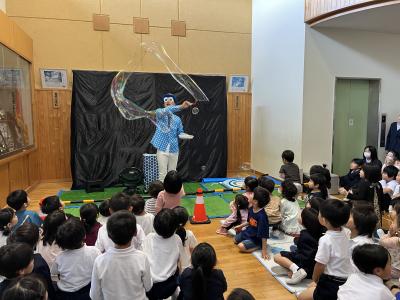 本日、保育所の皆さんと一緒にシャボン玉ショーを見ることができました。誰もがやったことのあるシャボン玉遊びですが、いろいろな大きさや変わったシャボン玉を見ることができ、児童たちは大喜びでした。