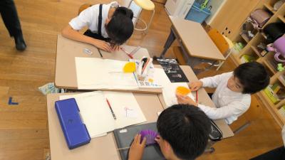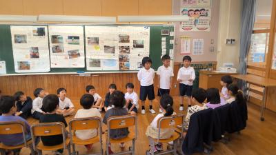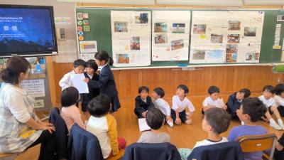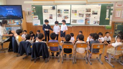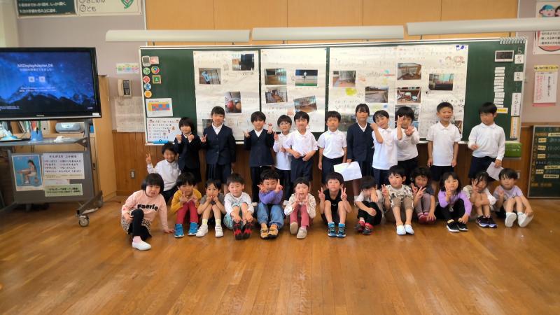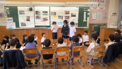 1年生の生活科で学校探検をしました。そこで発見したことを、保育所の年長さんに紹介しました。今は、同じ建物(校舎)の中にいるので、年長さんも分かりやすかったと思います。
