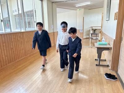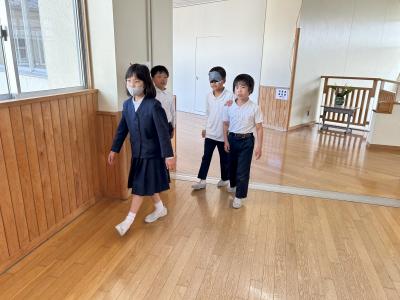 4年生は総合的な学習の時間に、福祉について学習をしています。その一環で本日は、アイマスを体験しました。