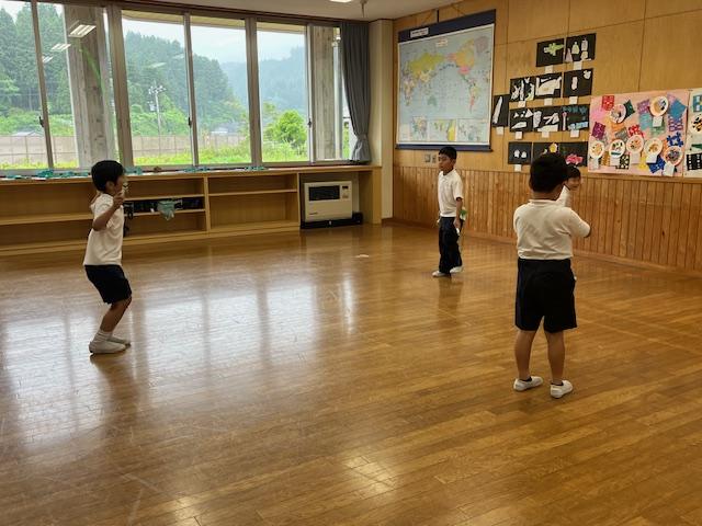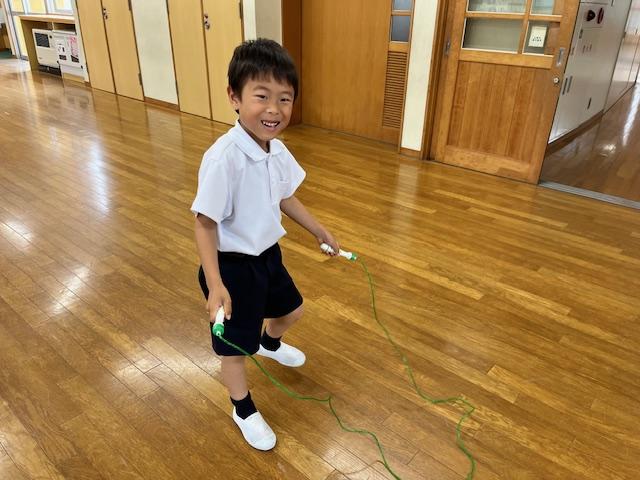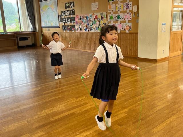 駆け足跳びや片足ケンケン跳びなどができている児童がいました。
