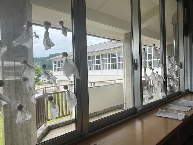 窓にずらりと並んだ『てるてる坊主』。4年生の教室です(^^♪