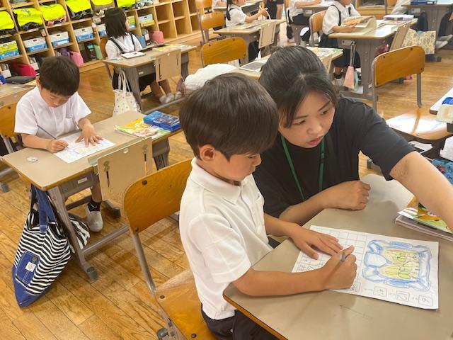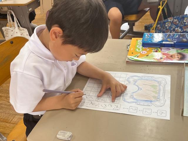 今日は、絵と文で観察したことをまとめていました。外には、毎日水やりをしている朝顔がすくすくと大きくなっています!