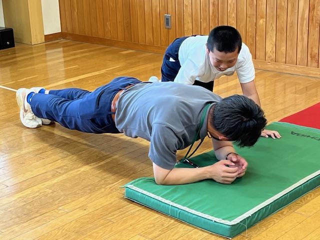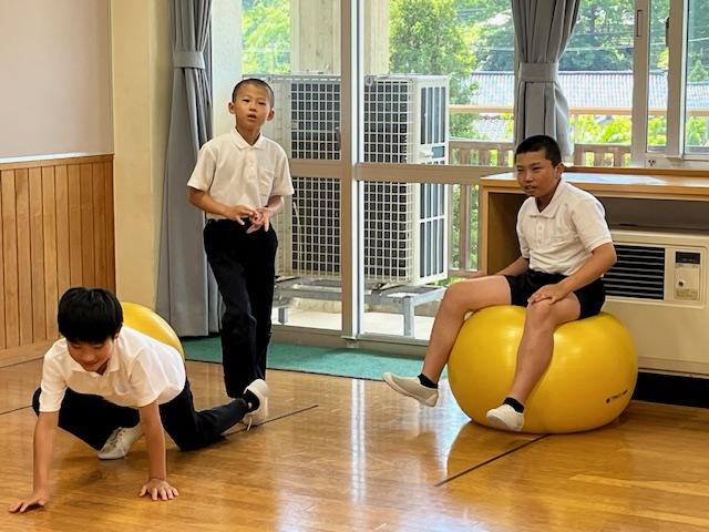 今日の長休み時間、バランスボールの使い方やマットの上で体幹トレーニングに励んでいる児童がいました。