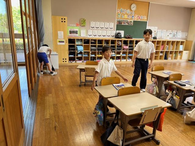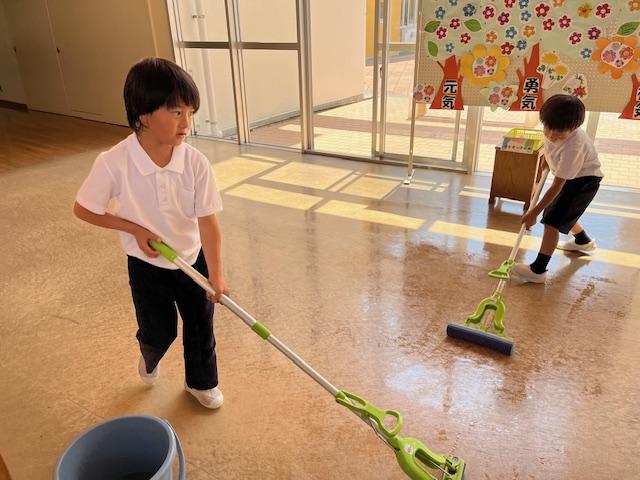 縦割り班活動の1つ。6年生が中心となり、学校をきれいにしています。1年生も、2年生も、水モップを使ったり、箒を使ったり。