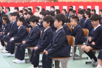 入学式に引き続き、1学期始業式を行いました。新1年生も2~6年生の列に混ざって並びなおし、一緒にお話を聞きました。進級し、新しい気持ちで頑張ろうとやる気に満ちた子ども達は良い姿勢でです。令和7年度も「元気」「勇気」「根気」で健やかで成長し続ける児童を育成していきたいと思います。