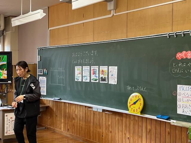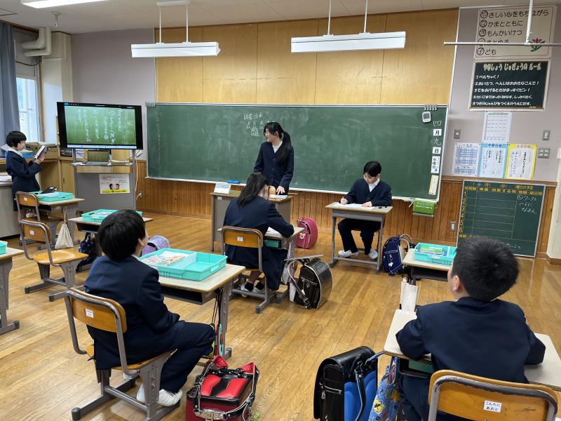 1年生は、動画を見ながら鉛筆の持ち方を確認していました。