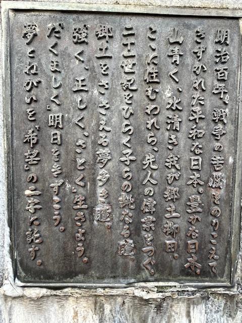 昭和44年3月に建立され、柳田村の隅屋虎二さんから寄贈していただいたものです。壁面には、その方の思いが記されていました。