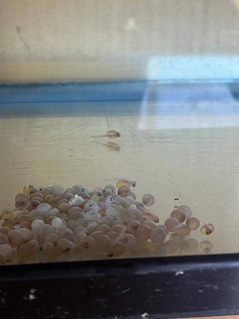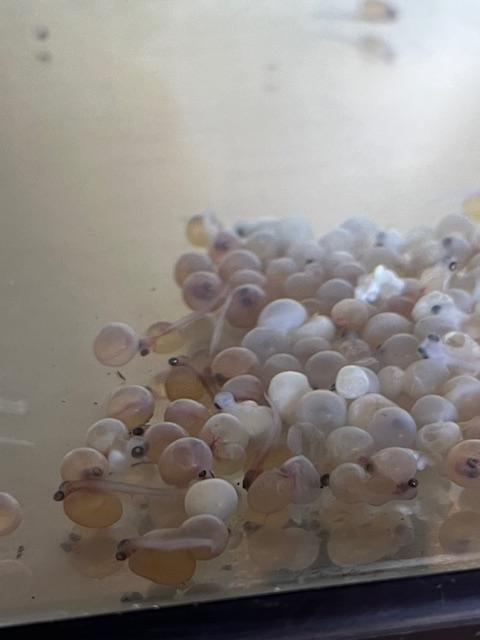 テレビや図鑑でみるような、お腹にぷっくりと卵を付けたままの稚魚が泳いでいます!