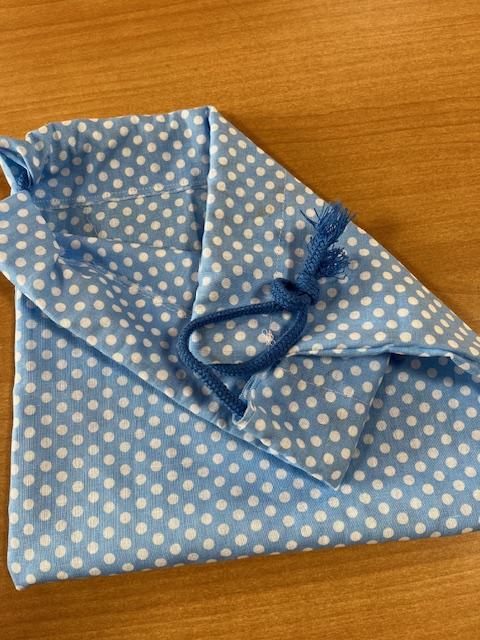 6年生からXmasプレゼントをもらいました。水色の生地に白い水玉模様の巾着。丁寧な縫い目。歯ブラシセットを入れようかなと思っています。