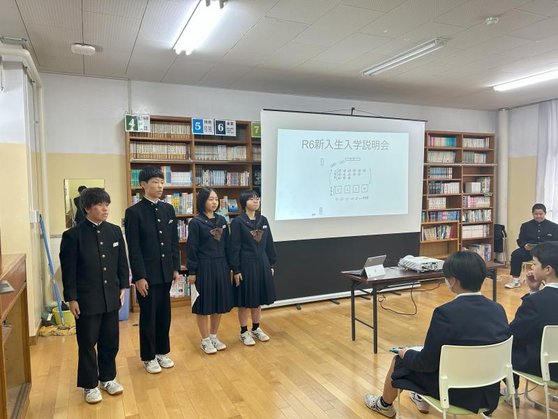 柳田小学校6年生をお迎えして、21日、新入生学校説明会が行われました。4つのグループに分かれて、「施設や学校の決まり」「学校行事」「学習」「部活」について説明を行いました。この日のために、2年生がいろいろと準備をしてくれました。少し緊張していたようですが、説明会はうまくいったようです。