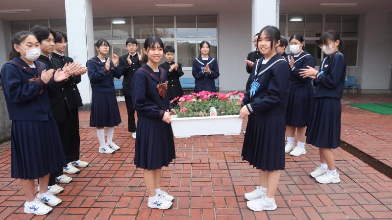 東陽中学校PTA様、町野小学校PTA様から、校舎を使わせてもらったお礼にプランターをいただきました。その贈呈式が12日にありました。