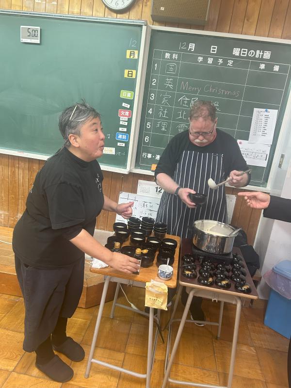 「能登イタリアンと発酵食の宿 ふらっと」を経営している船下智香子さんとベンジャミンさんをゲストティーチャーにお招きして、道徳「日本がほこる伝統や文化の継承」のお話を聞きました。また、能登の発酵食品の一つである「いしり」のみで味付けしたスープもいただきました。とても美味しかったです。
