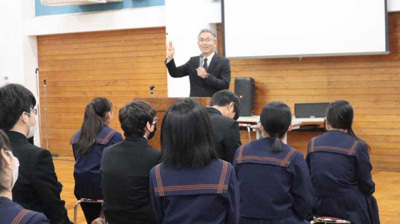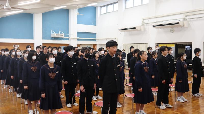 24日、2学期終業式を行いました。みなさんは、体育祭、文化祭等の学校行事や部活動の大会、コンクール等に大変頑張りました。2週間の冬休みは計画的に時間を使い、有意義な冬休みにしてください。