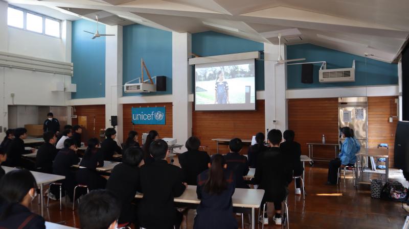 石川県ユニセフ協会、事務局長 染川さん、ボランティア運営委員 青木さんが来校されて、映画「ライズ&シャトル」の上映をしてくれました。