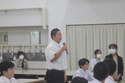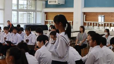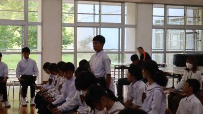 先月の能登半島豪雨により輪島市立東陽中学校が床上浸水の被害を受け、授業ができない状態になり、本校校舎を使って授業を再開することになりました。1日、東陽中学校生徒と先生方をお迎えして、対面式を行いました。これから東陽中学校の生徒と一緒に学校生活を頑張っていきましょう。本校、焼塩教頭先生のお話東陽中 柿本校長先生のお話柳中生徒会会長 杉田さんの挨拶東陽中生徒会会長 南さんの挨拶東陽中教職員の紹介