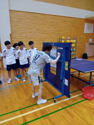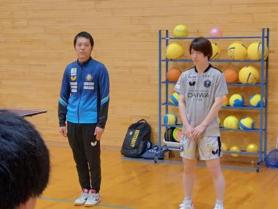 卓球Tリーグ男子の金沢ポート様から卓球台1台とラケット2個をいただきました。24日,柳田小学校体育館に於いて 金沢ポート株式会社 堀 様,元日本代表で主将の松平選手の参加のもと贈呈式が行われました。式の後には,短い時間でしたが,講習会もありました。生徒達はとても嬉しそうでした。