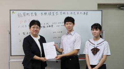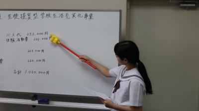 29日,能登町眞智教育長に能登町児童・生徒提案型学校生活充実化事業の計画案を説明し,受理していただきました。計画案は全校生徒で約100万円の使い方を考え,まとめたものです。生徒会長脇田さん,副会長池崎さんが説明しました。