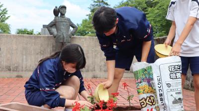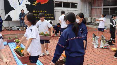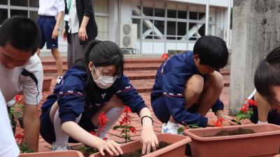 生徒会美化委員会が企画して,全校生徒で花植えを行いました。みんな楽しそうに作業していました。きれいな花が校庭にさいているととても気持ちが和みますね。心の花も咲きそうです。