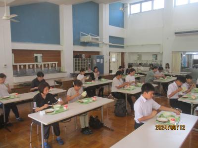 6月は食育月間です。本日,PTA給食部会が主催して給食試食会を開催しました。みんなで給食を食べた後は,給食担当の沖野先生から給食についてのお話がありました。給食は教育の一環として行っていることや食中毒や異物混入を防ぐためにいくつもの段階をふんで給食ができあがっているというお話でした。