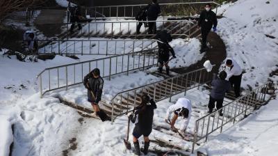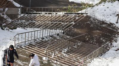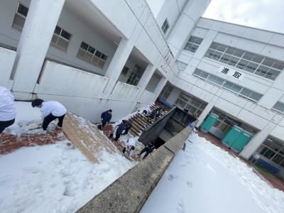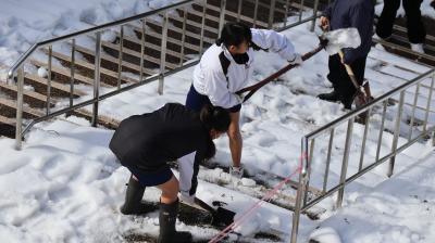 震災の影響で,授業は午前中4限で終わります。体育館は地震で壊れ使えません。1年生は体育の時間を使って登下校で通る階段の雪かきをしてくれました。みんな一生懸命してくれました。とても助かりました。