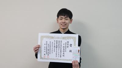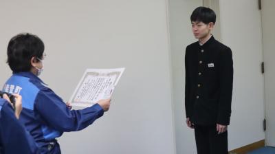 本来ならば,能登町役場で表彰式行われる予定でしたが,震災のためにできなかったので,眞智教育長が本校に来られて3年松島優真さんに表彰を行いました。