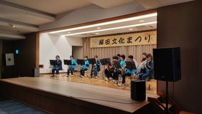 吹奏楽部が26日,柳田文化まつりに参加しました。生徒たちの演奏する曲に合わせて手拍子をするなど,楽しそうに演奏を聞いてくれました。