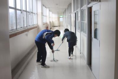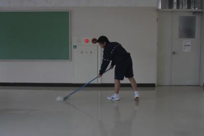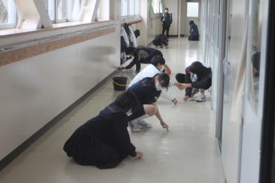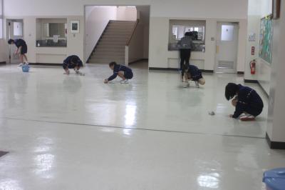 ピカピカ大作戦の一環として,今日(1日)は全校で床を磨き,美化委員会がワックスがけをしてくれました。床が光ってます。