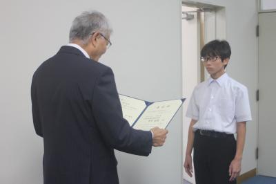 石川県からは,2年生青木さんの作品「全力! 北信越で輝く 君の舞台」が優秀賞に選ばれたことをうけて,石川県中体連会長 可長 様から表彰状が渡されました。