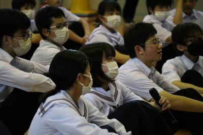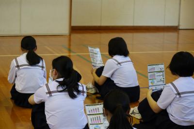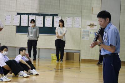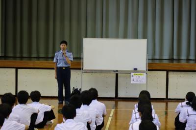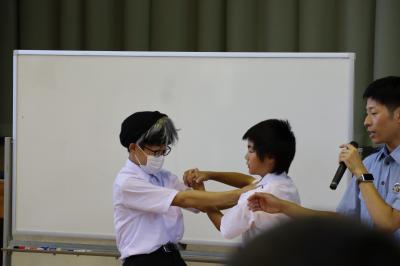 その後,防犯教室を行い,避難するときの合言葉「いかのすし」の確認,不審者と遭遇したときの対応・情報収集の仕方,護身術,ネットの危険についてもお話をしていただきました。生徒達は集中して警察の方のお話を聴いていました。