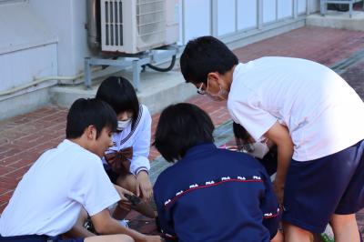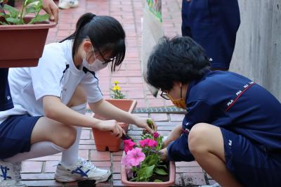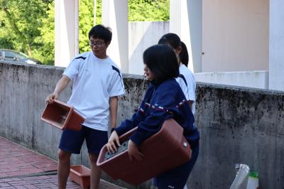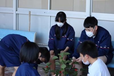 5月31日,生徒会美化委員会が中心となり全校生徒で花植えをしました。美化委員長の川崎さんから植え方の説明を受けた後,掃除の縦割り班ごとにプランタに花植え作業をしました。3年生がリーダーシップをとり短時間に作業を終えることができました。ご苦労様でした。花のある学校はいいですね!