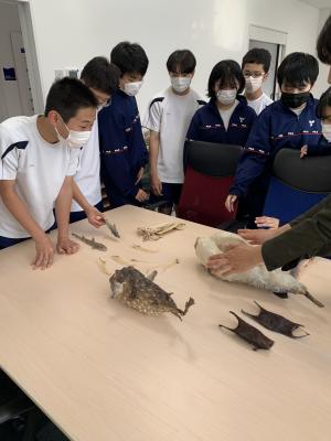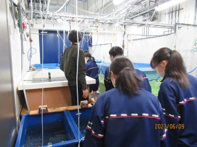2年生は,海洋学習で越坂の能登海洋水産センターに行きました。フグやサヨリなどの養殖の様子を見学したりお話しを聞いたりしました。また,研究室内部の様子や実験施設,はく製なども見せていただきました。トラフグの鋭い歯を抜くための麻酔実験が特に印象に残ったようです。いろいろ勉強になった海洋学習でした。