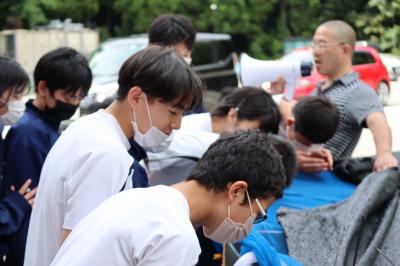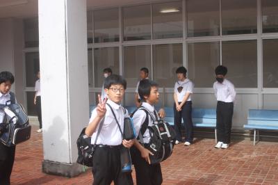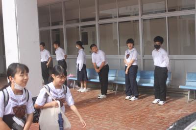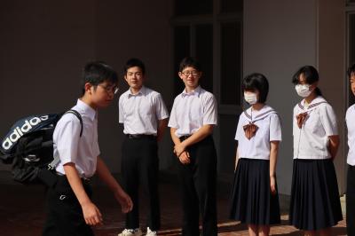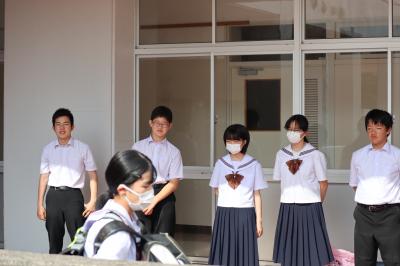 生徒会役員4名(会長:鍛治さん,副会長:池田さん,執行委員:角さん・田尻さん)と各学級代議員(1年:河端さん・二又さん,2年:西尾さん・脇田さん,3年:小寺さん・宮里さん)が毎週月・火・木・金の4日間,7時40分から7時55分の15分間,交代であいさつ運動を行っています。元気よくあいさつすると,声をかけた方も,声をかけられた方もとても気持ちいいですね!