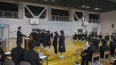 19日に前期生徒会役員任命式及び前期生徒総会が体育館で行われました。任命式では校長先生から役員一人ひとりに任命証書が渡されました。