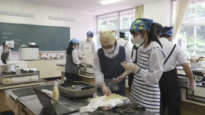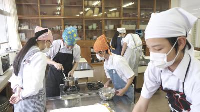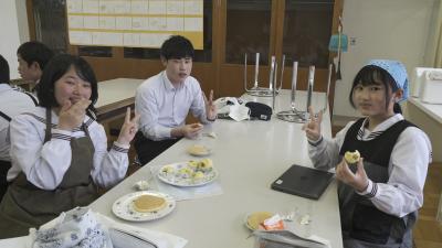 今日,3年生は家庭の時間で調理実習を行いました。「幼児のおやつ」という授業で,蒸しパン,フルーツ寒天ゼリー,ちぎりパンの中から班ごとに選んで作りました。試食しましたが,なかなか美味しかったです。
