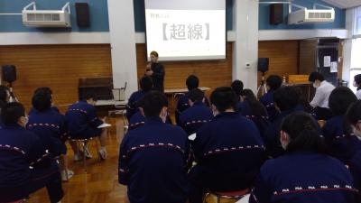 2月9日、再び盤戸大樹さんに来ていただいて、今回はメンタルトレーニングについて学びました。入試を乗り越えるための強いメンタルを獲得すべく3年生も参加しました。目標を達成するためには、具体的にイメージすること、日時を決めること、紙に書くことといったアドバイスをいただきました。また今までと違う考え方・判断・選択をすることによって、今まで知らなかった結果が得られると、励ましてもらいました。今日の学びが、未知の世界をたくましく生きていく柳中生の心構えの基本になることと思います。