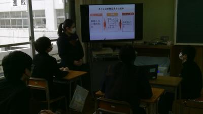 2月22日、生徒会保健委員会が「ストレス」をテーマにお話をしてくれました。朝の時間を利用して、「ストレスとは」「ストレスの種類」「ストレスを軽減するには」といった内容で解説がありました。最後に落ち着けるBGMを聞きながら、呼吸法を試していました。ご家庭でもぜひお試しください。