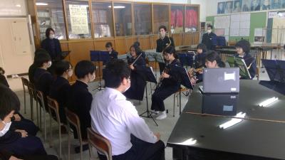 2月24日の昼休み時間に、吹奏楽部がミニコンサートを開き、卒業生に素敵なひと時をプレゼントしました。演奏曲は「世界で一つだけの花」「風になる」の2曲。卒業してゆく3年生にピッタリの選曲でした。外はまだ寒い冬の風が吹いていましたが、演奏会場は暖かな空気に包まれました。