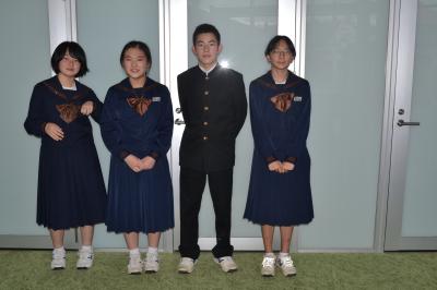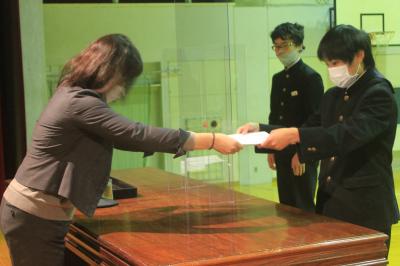 11月29日、「私が町長だったら」作文コンクールの表彰式がおこなわれました。このコンクールは夏休みに2年生が取り組みました。今回入選した3人のうち2人が町役場庁舎で行われた表彰式に参加しました。緊張した面持ちながら堂々とした態度で大森町長から表彰状を受け取りました。入選した3人は以下のとおりです。