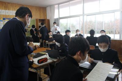 11月29日、金沢大学教授の滝沢雄一さんをお迎えして、2年生の英語の授業を見ていただきました。この日の授業は、観光客に道を教えるという実践的な内容でした。生徒はグループになったりペアになったりしながら道案内を練習していました。滝沢さんからは、「単元の見通しを持った学習の大切さ」について教えていただきました。本校はこれからも、英語力を効果的に伸ばすための授業を展開していきます。