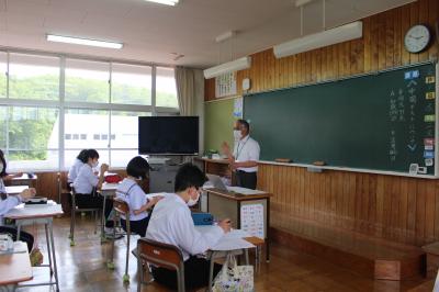 6月1日、柳田小学校から5人の先生をお迎えして、授業を見ていただきました。このうち1年生は初めて受けた中間テストについての解説授業でした。返却された点数に歓声が上がっていました。そのあと、記述式の問題への取組方法について学びを深めていました。授業が終わった後、小学校中学校の職員で意見交換を行い、ゲームやインターネットに費やす時間の実態などについて話し合いました。