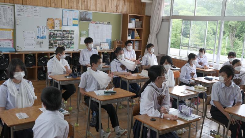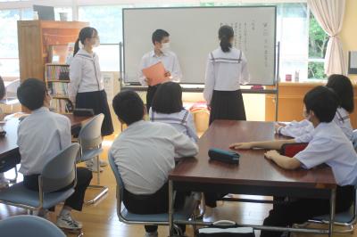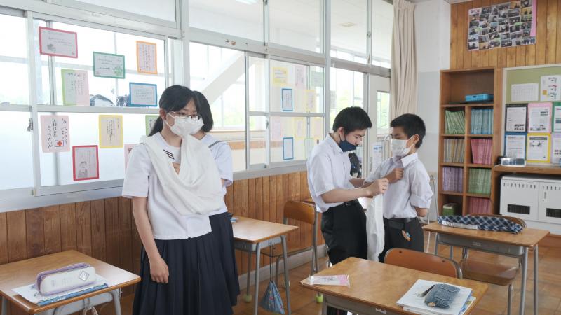 6月17日(金)に保健の授業「応急手当」の一環として、養護教諭から包帯法を学びました。三角巾を用いた腕の固定方法を指導してもらい、もしもの場面に備えました。