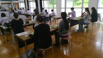 6月14日、PTAの給食部会主催の給食試食会がありました。この日は2年生の保護者が対象で、生徒の配膳から後片付けの様子を見ていただきました。メニューにはご飯と牛乳の他、いりどりや大豆と小魚のごまがらめの副菜、オレンジのデザートが加わりました。中学生にもどった気分で、給食のひと時を楽しんでいただけたようです。