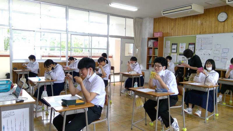 6月16日(木)5限2年生、6限1年生に小下美子歯科衛生士をゲストティーチャーとしてお招きし、歯みがき教室が行われました。歯垢染め出し液で歯垢を染め出し、その後丁寧にブラッシングしました。歯を「みがいたつもり」でも「みがけていない」ことがわかったことでしょう。これからの歯みがきをしっかりして欲しいと思います。