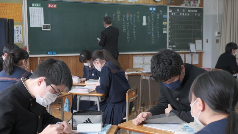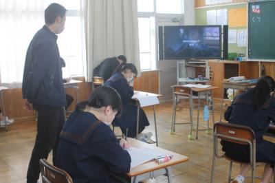 1月24日、奥能登教育事務所から3人の指導主事の先生をお迎えして授業を見ていただきました。生徒は、話し合い活動の中で活発に意見を交換し合い、学びを深めていました。本校では、日ごろからこうした「学び合う学習」を推進しています。これからは、話す力に加えてまとまった文章で自分の考えを表現する力もさらに伸ばしていけるよう授業の工夫に取り組んでいきます。