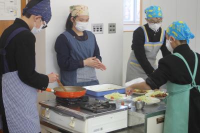1月27日、1年生の家庭科で調理実習がありました。メニューは「豚肉の生姜焼き」です。味付けしてフライパンで加熱する過程では初めは慣れない様子で菜箸を動かしていましたが、後半はだんだん慣れてきて自信を持って調理できるようになってきました。キャベツを刻んだりミニトマトを添えたりして、見た目も大変おいしい出来上がりとなりました。