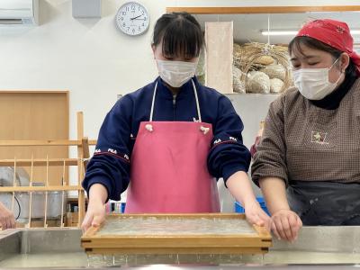 1月26日、卒業証書づくりも最終過程です。みわ会(久田和紙保存会)の皆さんに教えていただきながら「紙すき」をしました。3年生は何度か紙すきの経験はありましたが、証書はこれまでのものよりずっと大きいので、体全体を使ってすいていました。この日はNHKとテレビ金沢が取材にきました。インタビューを受けた生徒は自分の気持ちをしっかりと伝えていました。少しずつ卒業の日が近づいてきています。